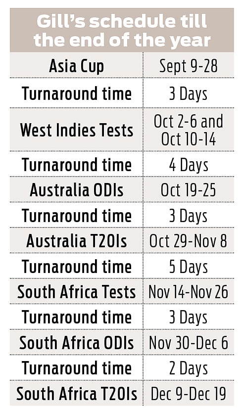 At some level, it's understandable. Gill is the new poster boy of cricket in India, an all-format superstar, a multi-format leader of men and the public face of many an FMCG. But that kind of ignores the unforgiving schedule the 26-year-old is currently on. His next meaningful break will be around Christmas and New Year when he has a few weeks off after South Africa. But post the New Year, he has a packed six months till the completion of the Indian Premier League (IPL).
