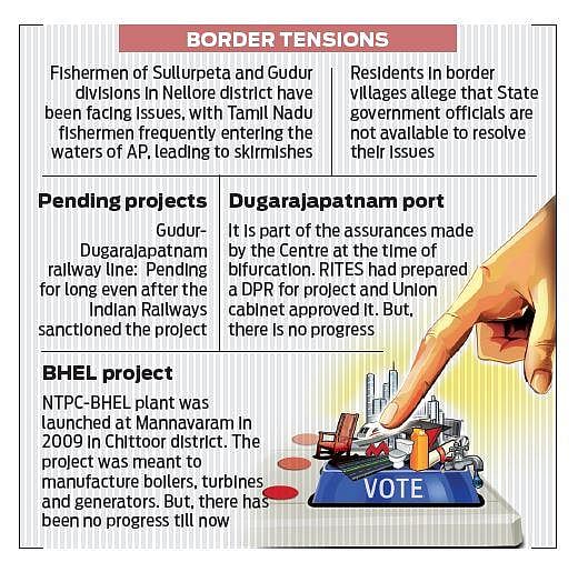 The seven Assembly segments falling under the Lok Sabha constituency have their own set of problems and each passing election, leaders of various political parties promised to resolve them, but in vain. With some of the villages sharing borders with Tamil Nadu, inter-state issues ranging from fishermen straying into the waters of Andhra Pradesh and others are some of the poll issues.