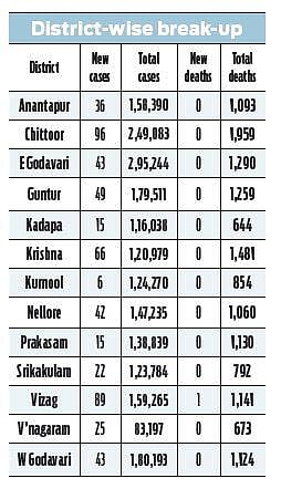 Kurnool and Vizianagaram are the only districts which reported less number of new cases when compared to Wednesday. With the fresh spike in the cases, the overall infections in Chittoor went past 2.49 lakh, while the cumulative cases in Visakhapatnam have crossed 1.59 lakh.