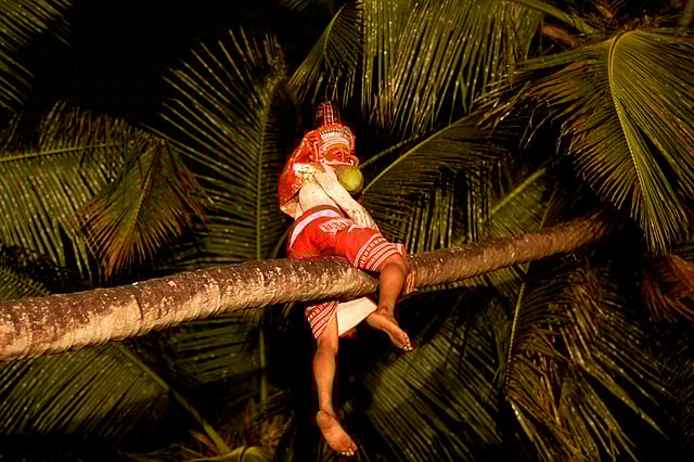 It portrays Lord Hanuman’s quest for Sita devi in Lanka. The Bappiriyan Theyyam performers climb coconut trees during the ritual, symbolising Hanuman’s attempts to scan faraway lands from vantage points. Driven by frustration at his unsuccessful search, Bappiriyan vents his anger by kicking the tree, causing coconuts to fall.