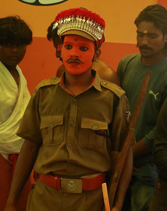 This annual spectacle, enacted at Padannakkad near Kanhangad in the Kasaragod district, portrays the story of Padaveeran, a soldier of yesteryear. The artist dons the police uniform and would admonish members of the audience about illegal activities, including smoking in public.