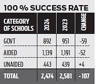 A total of 2,474 schools recorded 100% success rate, a drop of 107 compared to the previous year. While the number of government and aided schools that recorded all-pass dropped by 59 and 52, respectively, the number of unaided schools increased by four. The success rates in the Lakshadweep and Gulf region were 97.19% and 96.81%, respectively.