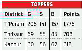 Thiruvananthapuram garnered 654 points in aquatics, winning 74 gold, 56 silver and five bronze. Athletes of Thundathil MVHSS contributed 27 gold to the haul. Among the capital district’s swimmers, Abhinav S and Mongam Theerdhu Samdev, with their three meet records, stood out.