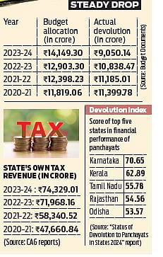 The total amount sanctioned to the three-tier LSGIs steadily declined from Rs 11,400 crore in 2020-21 to Rs 9,050 crore in 2023-24. In the latest year for which actual accounts are available, 2023-24, the transfer was Rs 5,100 crore less than the Budget allocation.