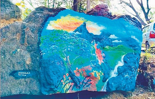“I joined the campaign seeing the forest department’s notice that anyone can participate in the cause. I have been living in Sholayur for the past 14 years and believe that through these campaigns, Attappadi’s rich natural beauty is not just being celebrated but also shielded from neglect and harm,” said Shanida KP, a teacher at the Government Tribal Higher Secondary School, Sholayur. Shanida chose a large boulder near the checkpoint where the Anamoolichuram begins for her painting.