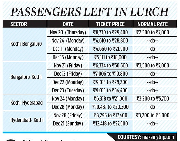 Ticket prices on Kochi-Bengaluru route for Thursday ranged from Rs 8,730 to a staggering Rs 29,400, compared with the normal range of Rs 2,300-7,000. And, fares on the Hyderabad-Kochi sector for December 21 (Sunday) hover from Rs 12,418 to Rs 27,900, far exceeding the normal Rs 3,200-5,000 range.