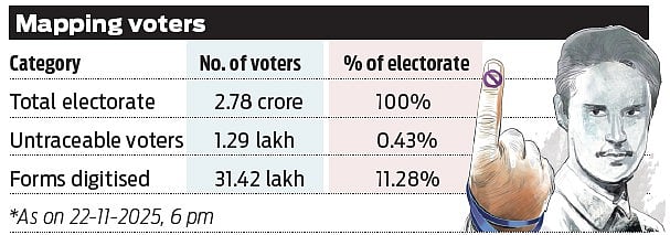 THIRUVANANTHAPURAM: With the enumeration forms for the Special Intensive Revision (SIR) of electoral rolls being distributed to 99.5% of the 2.78 crore voters in the state, the office of the Chief Electoral Officer-Kerala has decided to publish the list of 1.29 lakh voters who remained ‘untraceable’ owing to various reasons. This constituted 0.47% of the total electorate.