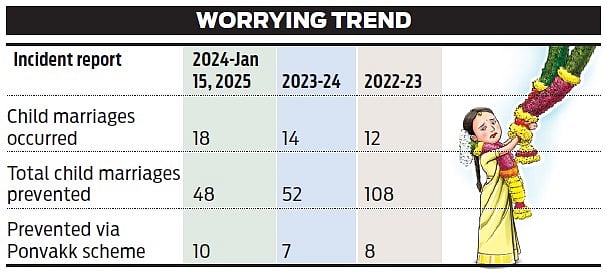 In 2022-23, officials stopped 108 child marriages. This dropped to 52 in 2023-24 and to 48 between April 2024 and January 2025. As many as eight child marriage attempts were foiled in 2022-23 under the state’s ‘Ponvakk’ scheme, which offers Rs 2,500 reward to those providing information about the crime. Seven cases in 2023-24 and 10 in 2024-25. However, the rise in actual occurrences shows that despite efforts, more cases are slipping through.