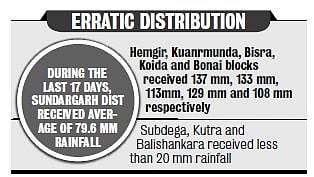 Sources said the normal rainfall in June is 237.4 mm. During the last 17 days, the district received average rainfall of 79.6 mm with Hemgir, Kuanrmunda, Bisra, Koida and Bonai blocks registering 137 mm, 133 mm, 113 mm, 129 mm and 108 mm respectively. But all areas of these blocks have not received equal amount of rainfall.