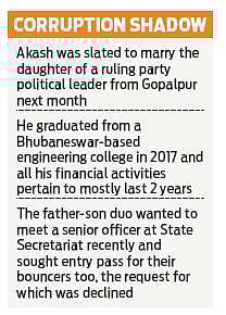Akash was slated to marry the daughter of a ruling party leader from Gopalpur next month. The anti-corruption wing had found a staggering Rs 9.4 crore cash deposits in Akash’s two bank accounts in Bhubaneswar of which Rs 8.4 crore was deposited in the Capital city itself. The Vigilance has also come across at least Rs 70 lakh in deposits made in Berhampur region. There are mentions of payments in WhatsApp chats too. The cash deposits as well as Abhay and his son’s splurge on charter flights, hotels, travels to