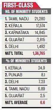 Kerala also topped the country in percentage of minority students. According to the report, 24.9 per cent of total students studying in 931 higher education institutes were from minority communities. This was four times higher than the national average of 6.6 per cent. Tamil Nadu’s numbers were marginally above national figures — 6.89 per cent.