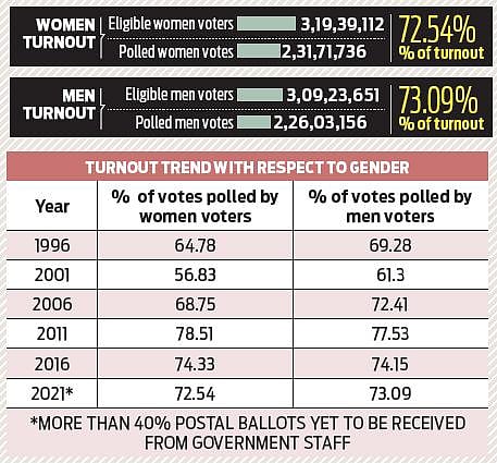 In the 2021 elections to the Tamil Nadu Assembly, 72.54 per cent women cast their votes, while the turnout stood at 73.09 per cent for men.2021 Ass embly elections.Decisive woman power.Women outnumber men in electors list by 5-10 lakh since 2006.The State has got more women voters than men in 2006, 2011, 2016 and 2021In 2011 and 2016 elections, women had slightly outnumbered men. AIADMK won with majority in both the polls under the leadership of J JayalalithaaIn 2006 and 2021, the percentage of women turnout was slightly less than that of men. In 2006, DMKCongress alliance defeated the AIADMK.Follow The New Indian Express channel on WhatsApp Download the TNIE app to stay with us and follow the latest
