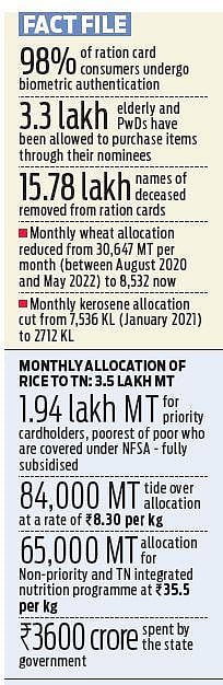 According to the TN e-governance agency, 15.78 lakh ration card holders died last year. The exercise helped the department identify genuine beneficiaries from the economically weaker sections, making them eligible for enhanced allocation of food items under the National Food Security Act. To ensure zero wastage of food grains at ration shops, the civil supplies department also decided to serve four commodities- rice, tur dal, wheat and sugar in packets.
