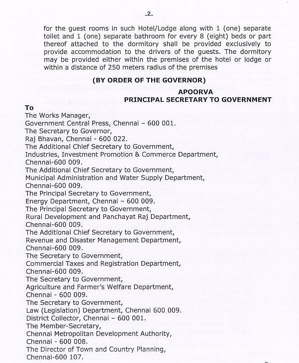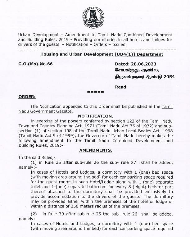 The Tamil Nadu Combined Development and Building (TNCDB) Rules, 2019 has been amended mandating hotels and lodges to provide amenities such as dormitories to vehicle drivers.