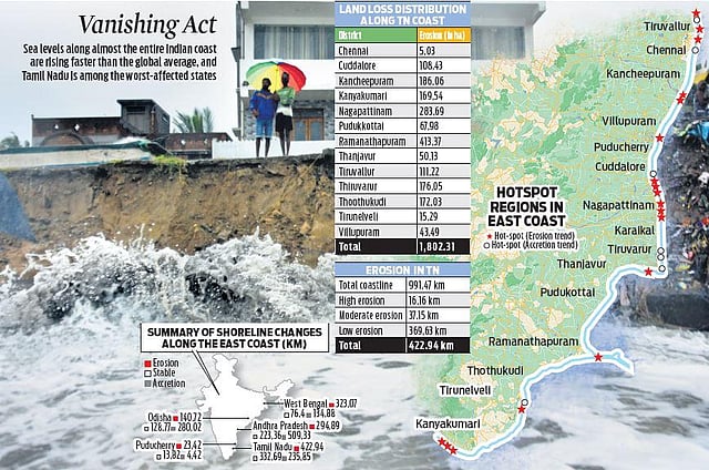 Some of these hotspots where long tracts of seashore that have vanished are located near Chennai. Districts such as Tiruvallur and Kancheepuram have about eight such locations out of the total 22. A deeper analysis of the NCCR study, which was based on satellite data acquired from 1990 to 2018, paints a grim picture: nearly 60% of the 125 km of coastline of these two districts is facing an immense loss of land. In Kancheepuram, 51 km out of 84.41 km of the coast is facing an onslaught of the sea while 18 km out of 40.97 km in Tiruvallur is under threat.