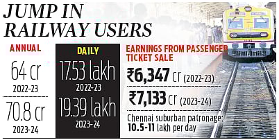 The data accessed by TNIE reveals that, on an average, 19.39 lakh passengers travelled per day in 2023-24, compared to 17.53 lakh the previous year. The Chennai suburban network accounts for more than 50% of the total passengers carried by Southern Railway. In the four suburban sections of Chennai, around 10.5-11 lakh passengers took the train daily.