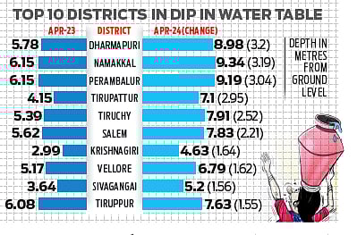 According to the Water Resources Department’s (WRD) groundwater data for the month of April accessed by TNIE, some of the western districts have witnessed the steepest decline in water level.