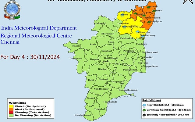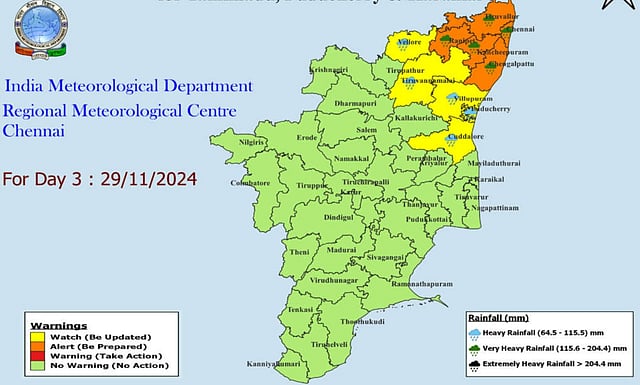 On November 28, orange alert was issued for Kancheepuram, Chengelpattu, Villupuram and Cuddalore district and Pondicherry as heavy to very heavy rainfall is forecasted.
