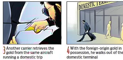 This carrier will get down at Bengaluru and relay the information to the mastermind, who will pass it on to another carrier who boards the same aircraft running its domestic trip, say from Bengaluru to Chennai. The second carrier books a different seat, however, manages to retrieve the gold after the flight lands in Chennai and exits through the domestic terminal.