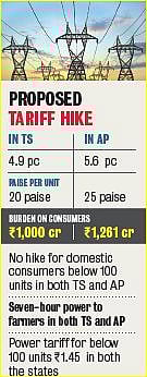 The power tariff hike proposed by AP Discoms is 5.6 per cent and the burden on consumers around Rs 1,200 crore. Telangana Discoms submitted annual revenue requirement (ARRs) before TS Electricity Regulatory Commission (TSERC) on Saturday night.