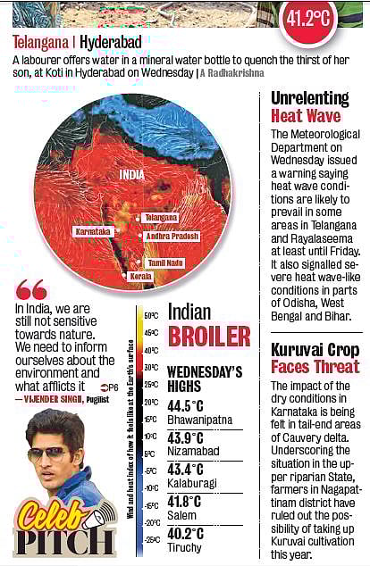 The Meteorological Department on Wednesday issued a warning saying heat wave conditions are likely to prevail in some areas in Telangana and Rayalaseema at least until Friday. It also signalled severe heat wave-like conditions in parts of Odisha, West Bengal and Bihar.