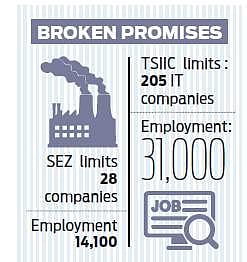 In Telangana, 1,940 hectares of land was notified in SEZ limits and 1,200 hectares is vacant. Similarly, 283.47 hectares of land is notified in TSIIC of which 51.46 acres is vacant. Under SEZ there are 28 companies that were allotted land and are functioning. Though a lot more should get employment but only 14,100 were provided jobs.