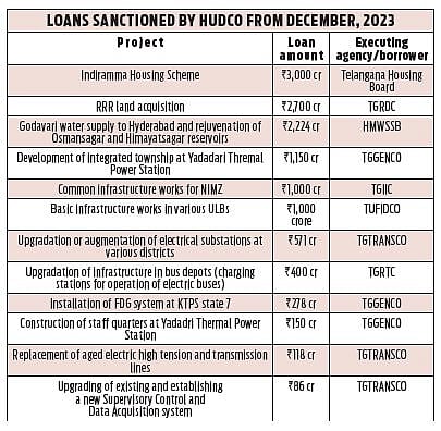 From December 2023, when the Congress formed the government in the state, and till now, the HUDCO sanctioned loans to the tune of Rs 12,677 crore for 12 projects, including Rs 3,000 crore for construction of Indiramma houses, Rs 2,700 crore for acquiring land for Regional Ring Road (northern stretch), Rs 2,224 crore for Godavari water supply to Hyderabad and rejuvenation of Osmansagar and Himayatsagar reservoirs.