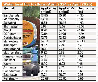 The Groundwater department recorded levels during April 2025 through 57 piezometers across 46 mandals within GHMC limits up to the Outer Ring Road (ORR). Compared to March 2025, the area registered a net fall of 0.40 metres. However, compared to April 2024, a slight rise of 0.08 metres was recorded.