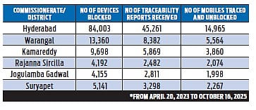 According to the CEIR dashboard, state police had recovered over one lakh mobile devices as of October 16. The Hyderabad Commissionerate accounted for the majority of recoveries, followed by Warangal, Kamareddy, Rajanna Sircilla, Jogulamba Gadwal, and Suryapet.
