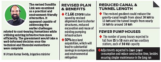 During a review meeting on irrigation projects held here, the minister said the government had studied the feasibility of a revised alignment through the Sundilla Link, which could lower project expenditure by around 10 to 12 per cent, reduce land acquisition by nearly half, and save approximately Rs 1,500 crore to Rs 1,600 crore when compared to earlier plans.