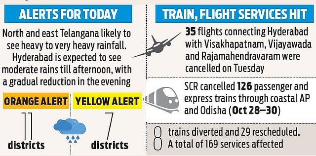 For Wednesday, the IMD has issued an orange alert for heavy to very heavy rainfall at isolated places in Adilabad, Mancherial, Nirmal, Jagtial, Karimnagar, Peddapalli, Jayashankar Bhupalpally, Mulugu, Bhadradri Kothagudem, Khammam and Mahbubabad districts. A yellow alert has also been issued for isolated heavy rainfall in Komaram Bheem Asifabad, Nizamabad, Rajanna Sircilla, Hanamkonda, Jangaon, Siddipet and Yadadri Bhuvanagiri districts.