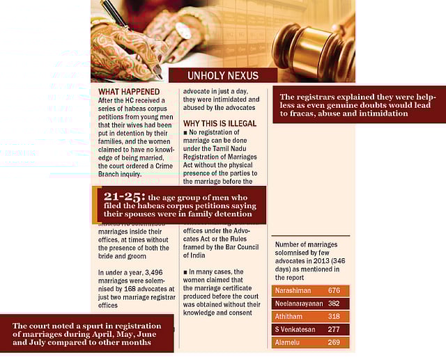 In all such cases, the marriages were registered by just two marriage registrars —North Chennai and Royapuram. Growing suspicious over the series of habeas corpus petitions that were filed and disposed off in this fashion, the High Court ordered a thorough inquiry by the Crime Branch last December. Their report was nothing short of shocking.