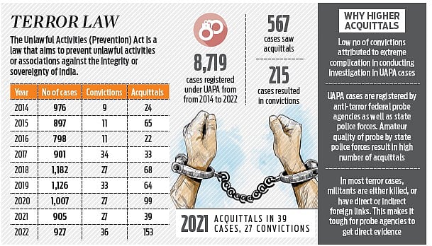 A senior IPS officer, who once had a stint with the NIA, said, “The cases under the UAPA are registered not only by the anti-terror federal probe agency, but by the state police forces. Because of the poor and amateurish quality probes by the state police forces, acquittals are high. The National Investigation Agency has a conviction rate of over 90% and officers probe the cases on merit. The figures are concerning, and state police forces need to fix their limitations.”