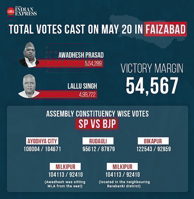 Lallu Singh got a lead only in the Ayodhya assembly constituency which is the seat of the Ram temple. In all other assembly segments, he trailed as Awadhesh Prasad got immense support from his own Dalit community besides the consolidation of OBC and Muslim votes in his favour.