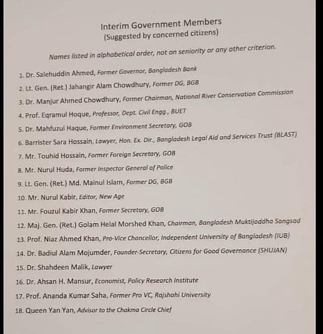 A list of suggested individuals for the interim cabinet, proposed by concerned citizens, has been widely circulated. However, there has been no official confirmation regarding the new cabinet's composition.