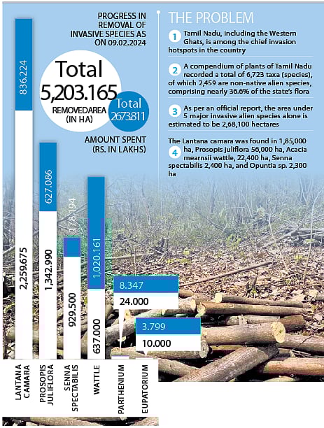 Supriya Sahu, Additional Chief Secretary, Environment, Climate Change and Forests Department, told TNIE: “Chief Minister M K Stalin had made removal of invasives a priority area and Tamil Nadu is the first state to have a dedicated invasive species removal policy. So far, we have removed invasives from 5,203 hectares spending close to Rs 27 crore.”