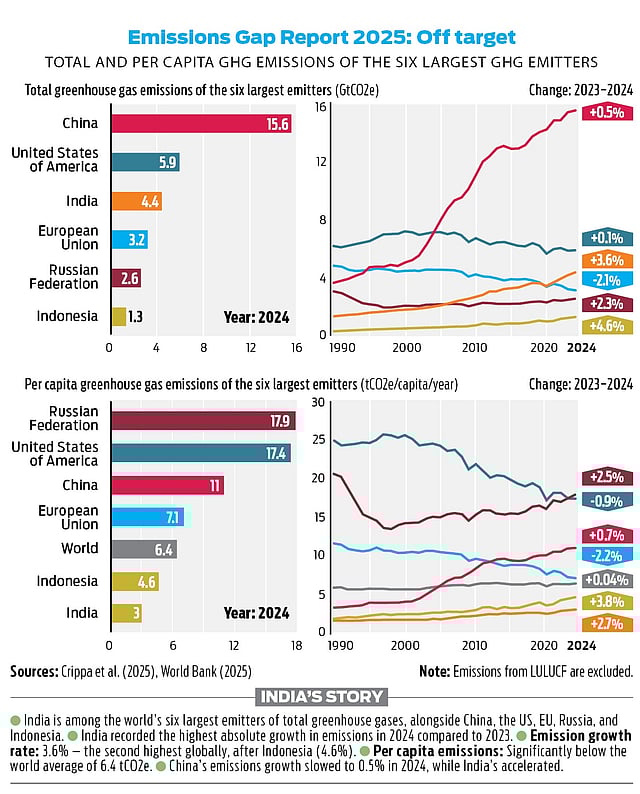 The UN Environment Programme’s Emissions Gap Report 2025, released just days before the talks, lays bare the scale of the crisis. Even if all current national climate pledges are fully implemented, the world is still on track for 2.3°C–2.5°C of warming this century. Under current policies, the trajectory rises further to 2.8°C — far above the 1.5°C limit scientists say is essential to avoid catastrophic climate impacts. Only a third of the countries have submitted updated national climate plans and those that have fallen short of closing the gap. Global greenhouse gas emissions climbed to 57.7 gigatons of CO2-equivalent in 2024, a 2.3 per cent increase from the previous year and the highest level ever recorded. “The world is still off target,” said UNEP executive director Inger Andersen. “Each time countries revise their pledges, the trajectory improves slightly — but nowhere near fast enough. We are now in a race against time and politics.” The report warns that the multi-decadal average of global temperature rise will exceed 1.5°C within the next decade, marking the beginning of a dangerous overshoot period. To limit the overshoot to 0.3°C and return to 1.5°C by the end of the century, global emissions would need to fall 26 pc by 2030 and 46 pc by 2035 compared to 2019 levels — an unprecedented drop in less than ten years.