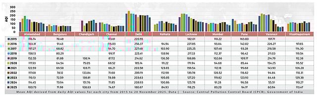 The study compared mean AQI values across 11 major cities, including Delhi, Bengaluru, Mumbai, Chennai, Varanasi, Lucknow, Ahmedabad, Pune, Visakhapatnam, Kolkata, and Chandigarh. It concludes that “none of the top urban centres in India can be considered safe in terms of air quality”, despite improvements in select cities after 2020.